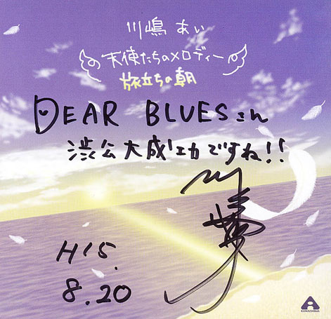 aiBBS常連さんたちの書き込みでも分かるかと思いますが、渋谷公会堂公演後のわたしも他聞にもれず、心に大きな穴が空いた様でした。その気持ちに決着をつけるべく、あいちゃんが唄っていたハチ公前、ライトオン前、渋公前、代々木公園入口の石畳… とそれぞれを歩きました。「いるわけないんだよな…」と自嘲気味にそれぞれの場所をデジカメで記念に写真を撮りながら歩き、ある程度気持ちが落ち着いたところでデジカメをカバンにしまって原宿方面に向かって歩き出した時、見覚えのあるキーボードが目に入りました。見覚えのある人…??? 学生スタッフのPさん??? なんでいるの???頭が理解を拒んでいました(笑)。そしてCDにサインを入れている制服姿ではない大人っぽいあいちゃんを観るにおよび「もう路上演ってるの!?」とようやく理解出来ました。「あいちゃんに時間が出来たので… 渋公後初の路上なんですよ」と言われ興奮しました。写真なんか撮ってなければ1曲くらい聴けたのに!(笑)「あいちゃん、渋公成功おめでとう!」とCDを買うのに並んだ列から声をかけました。「あーっ!ブルースさん! なんでいるんですか!」とこっちが聞きたいよ…(^^;)「これからも告知なしで路上は演るつもりなんです。ですから毎週ってわけにはいかなくって… なのでブルースさんたちにももう会えないかもしれないって思ってました!」って。。。なんて泣かせるコなんだろう…(泣)「中途半端はイヤなんです、まだ目標が残ってるんで」と以前と変わらないその目がキラキラしていました。こんな日にCDを買わないわけにはいかない!「天使たちのメロディー/旅立ちの朝」を買うことにしました。「ブルースさんには20日の日付けですね!」と言うので「今日は30日、嘘はいかんよ〜」とヘラヘラしつつ、サインを入れてくれたジャケットを見ると「渋公大成功ですね!!」…映画を観てる様でした。。。
