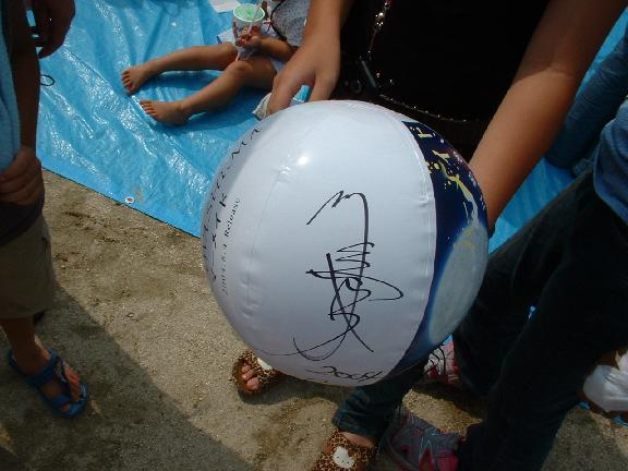 9月20日 山口県岩国ライブにて、1回目(午後1時〜)のステージで、 会場限定5名にプレゼントされたサイン入りマーメイドビーチボールです。 ライブの途中に川嶋がステージからスパイクして、ラッキーな5人がゲットしました。 写真は、ゲットした女の子にお願いして撮らせていただいたものです。 岩国の親子さんありがとうございました。(ころりん)